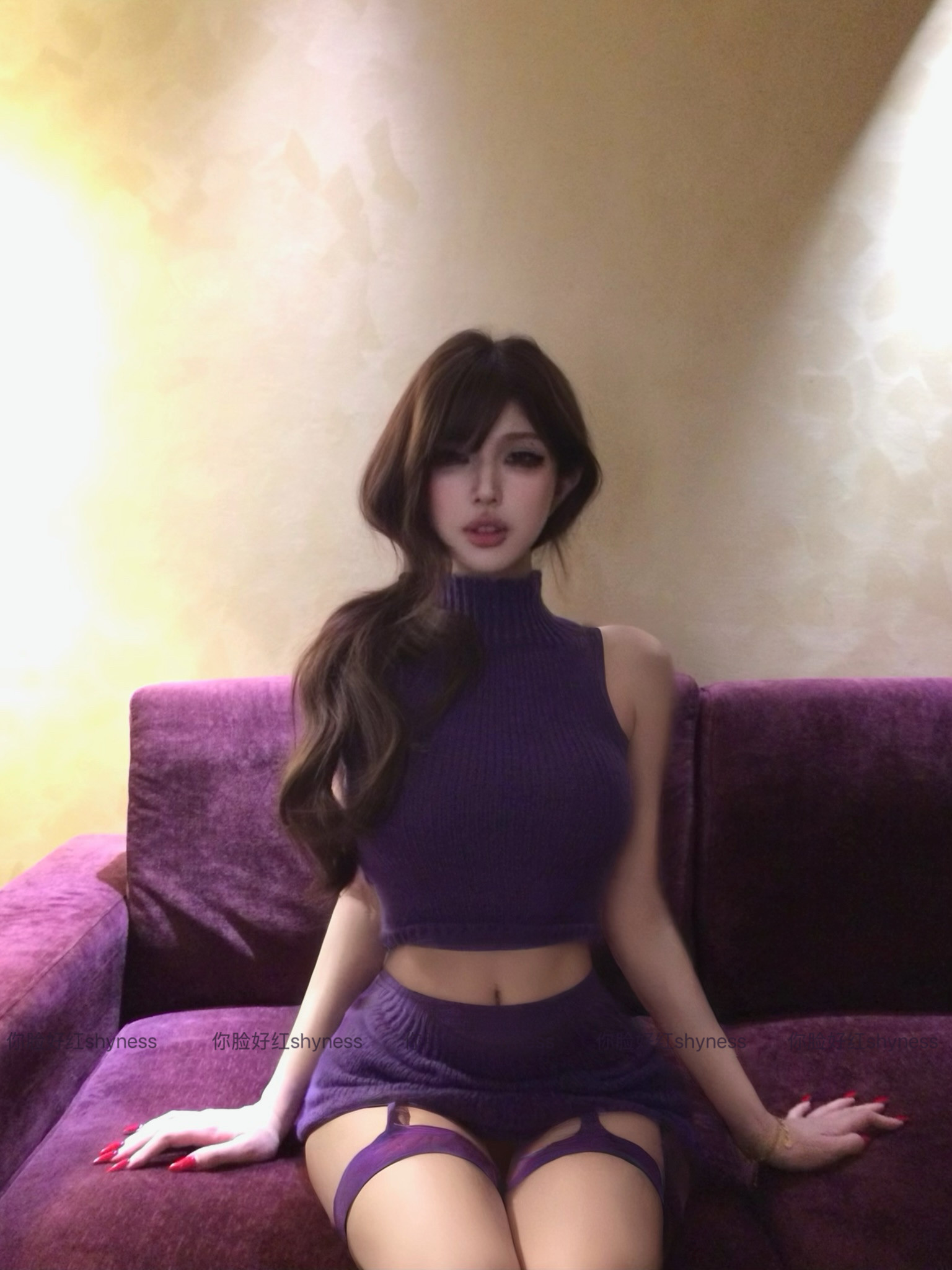 你脸好红shyness-雾漫葡萄-纯御紫色镂空毛衣性感包臀短裙套装