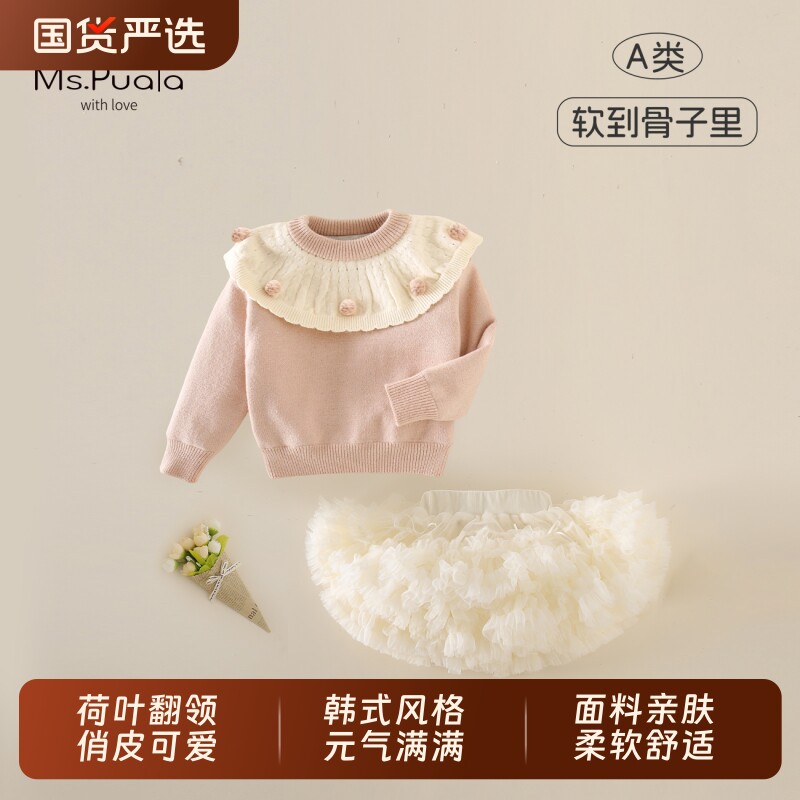 Ms.Puala女童套装女宝可爱粉色荷叶领毛衣杏色蓬蓬短裙春季两件套