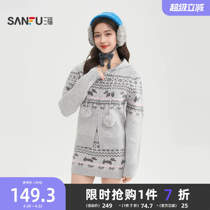 三福时尚套装2026新款春季费尔岛风连帽毛衣短裙两件套女装519864
