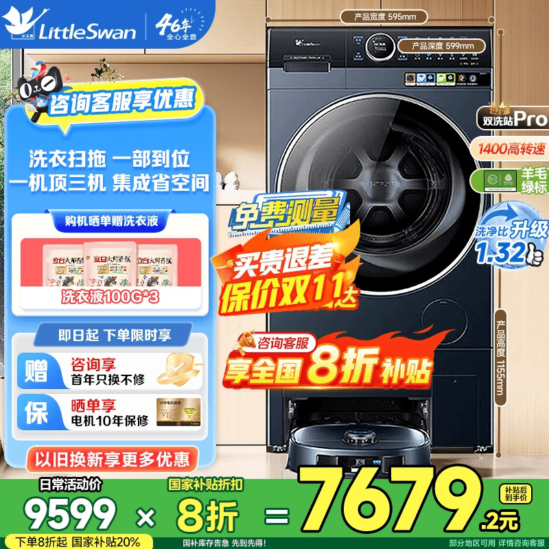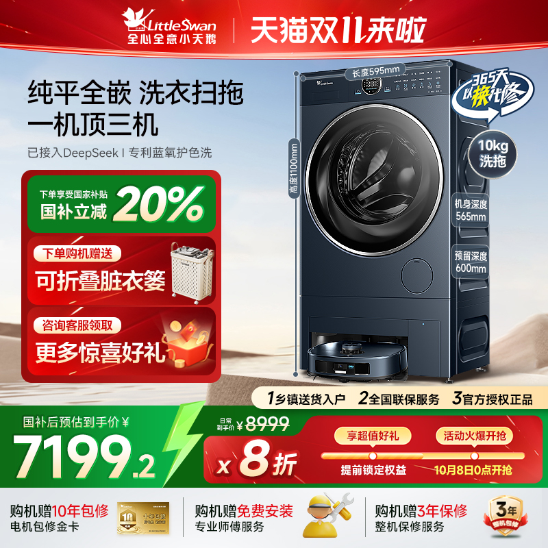 [小天鹅双洗站PRO]超薄10kg滚筒洗衣机全自动扫地拖地机器人组合