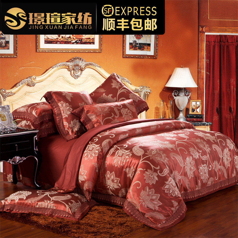 欧式奢华桑蚕丝婚庆床上用品蕾丝提花六件套结婚陪嫁裸睡真丝套件