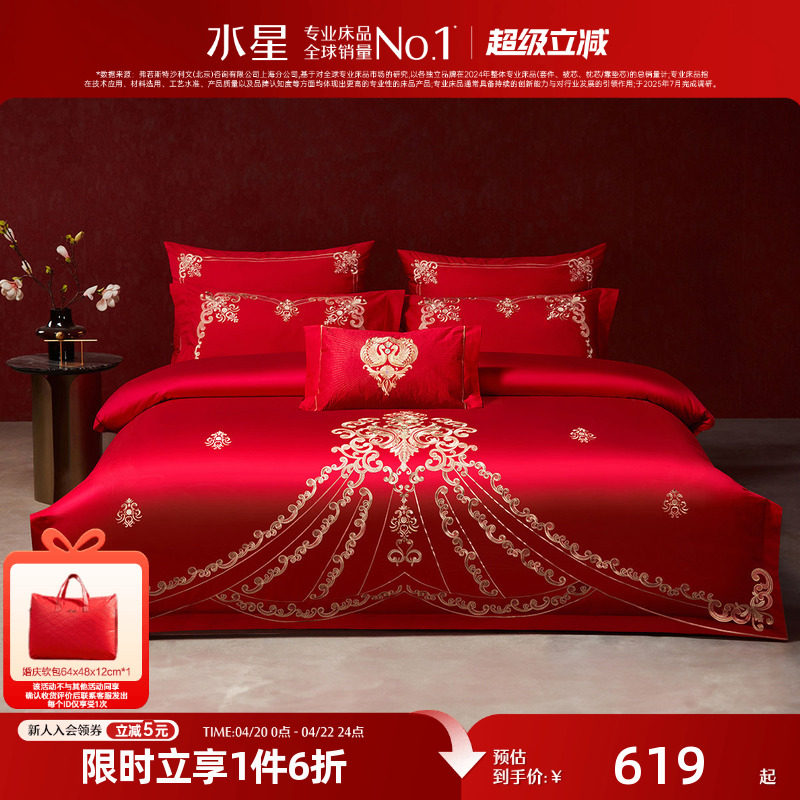 水星家纺结婚四件套婚庆欧式婚床结婚被套件大红色六件套床上用品