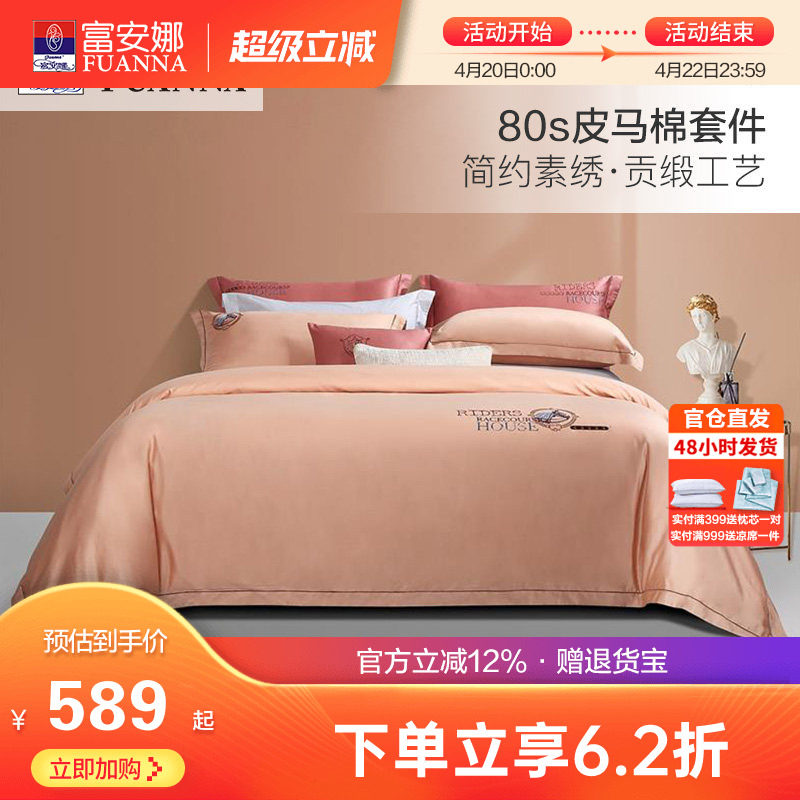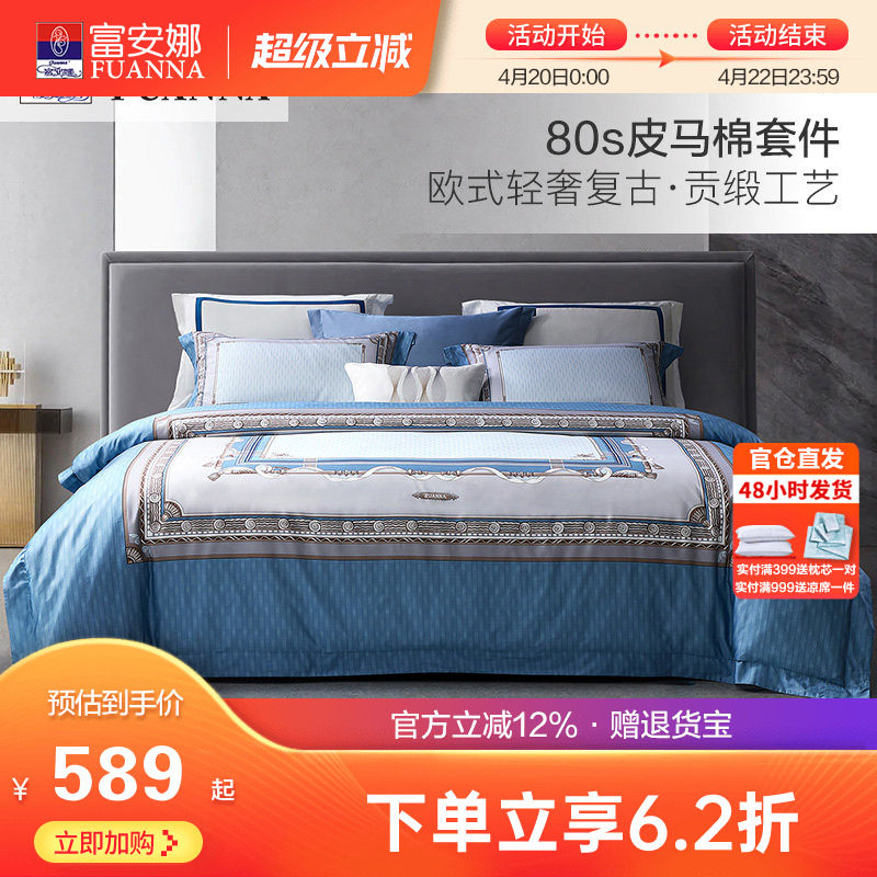 富安娜80支皮马棉床上四件套纯棉全棉被套床单欧式双人匹马棉套件