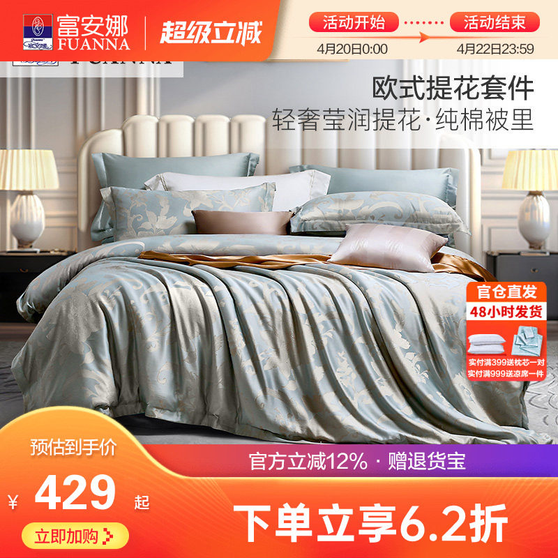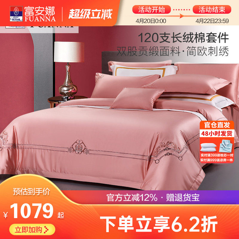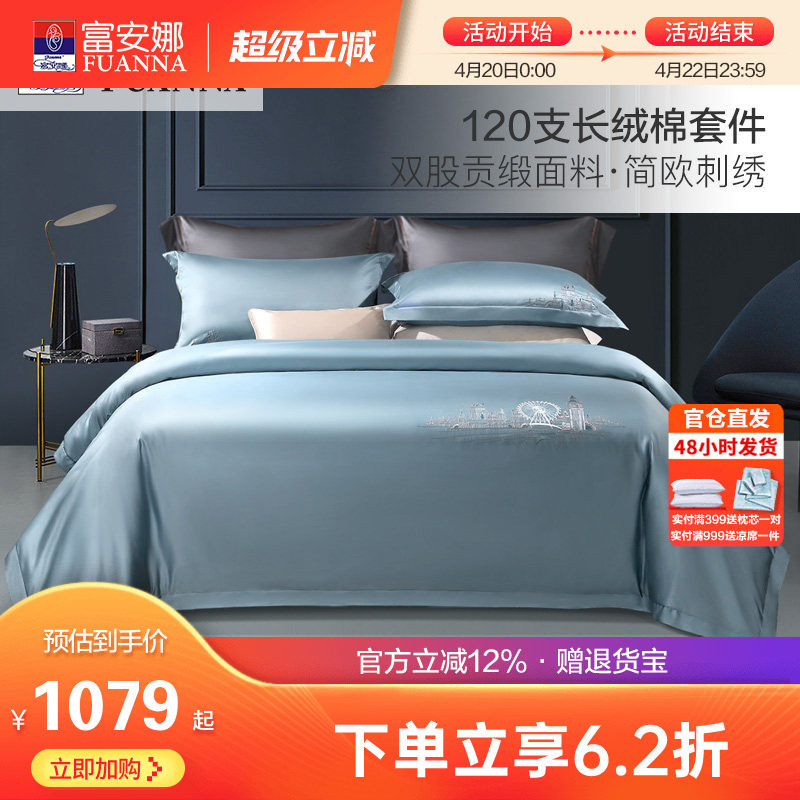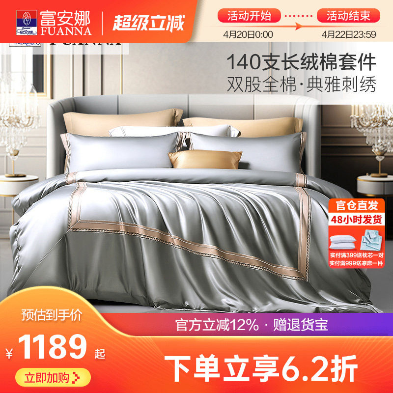富安娜140支双股长绒棉床上全棉四件套纯棉被套床单双人欧式套件