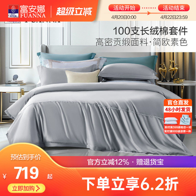 富安娜100支长绒棉床上全棉四件套纯棉被套床单双人欧式素色套件