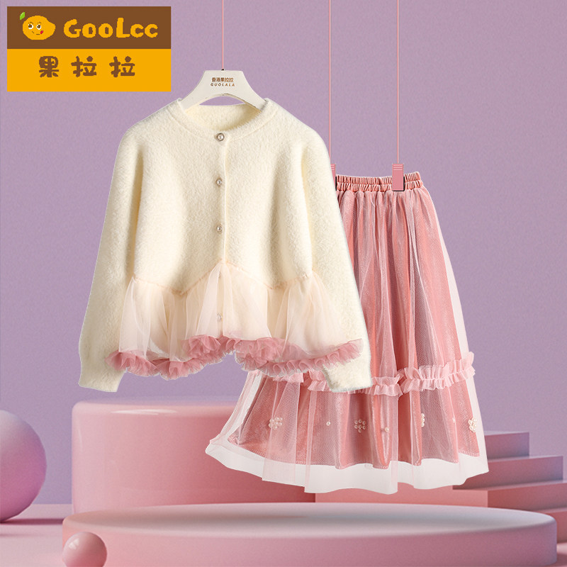 法式公主女童套装裙子女宝宝水貂绒开衫金丝绒半身裙两件套秋冬装