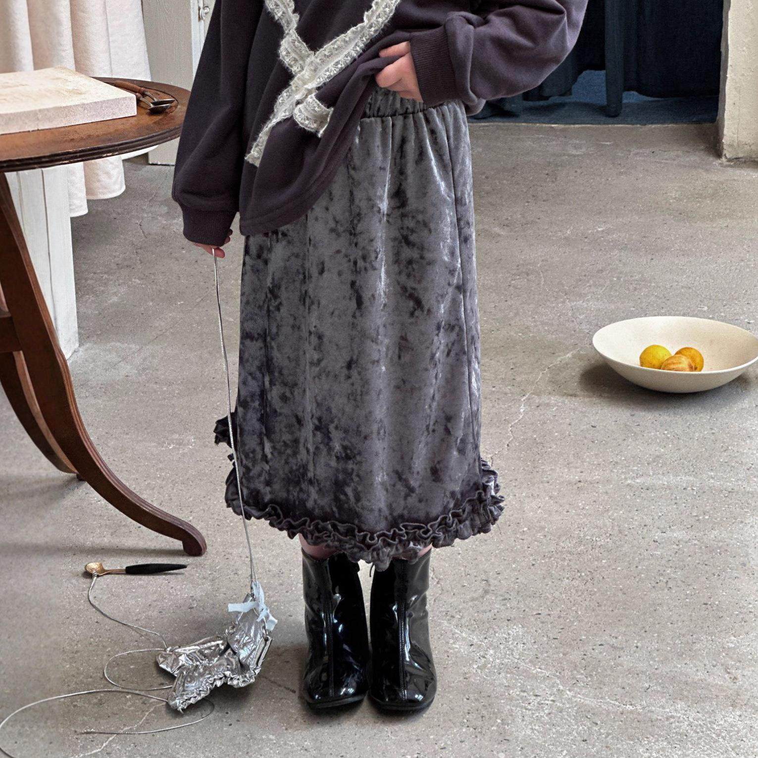 香港BAKUXIA女童金丝绒半身裙秋冬儿童复古花边中长打底半裙百搭