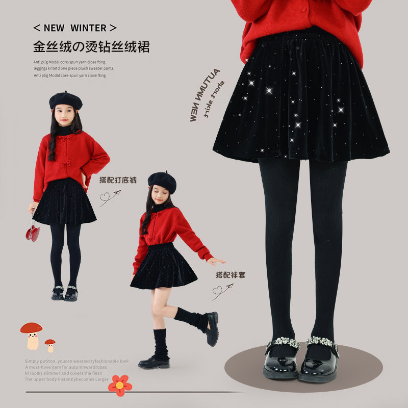 女童金丝绒半身裙秋冬款儿童洋气韩版加绒裙子小女孩冬装烫钻短裙