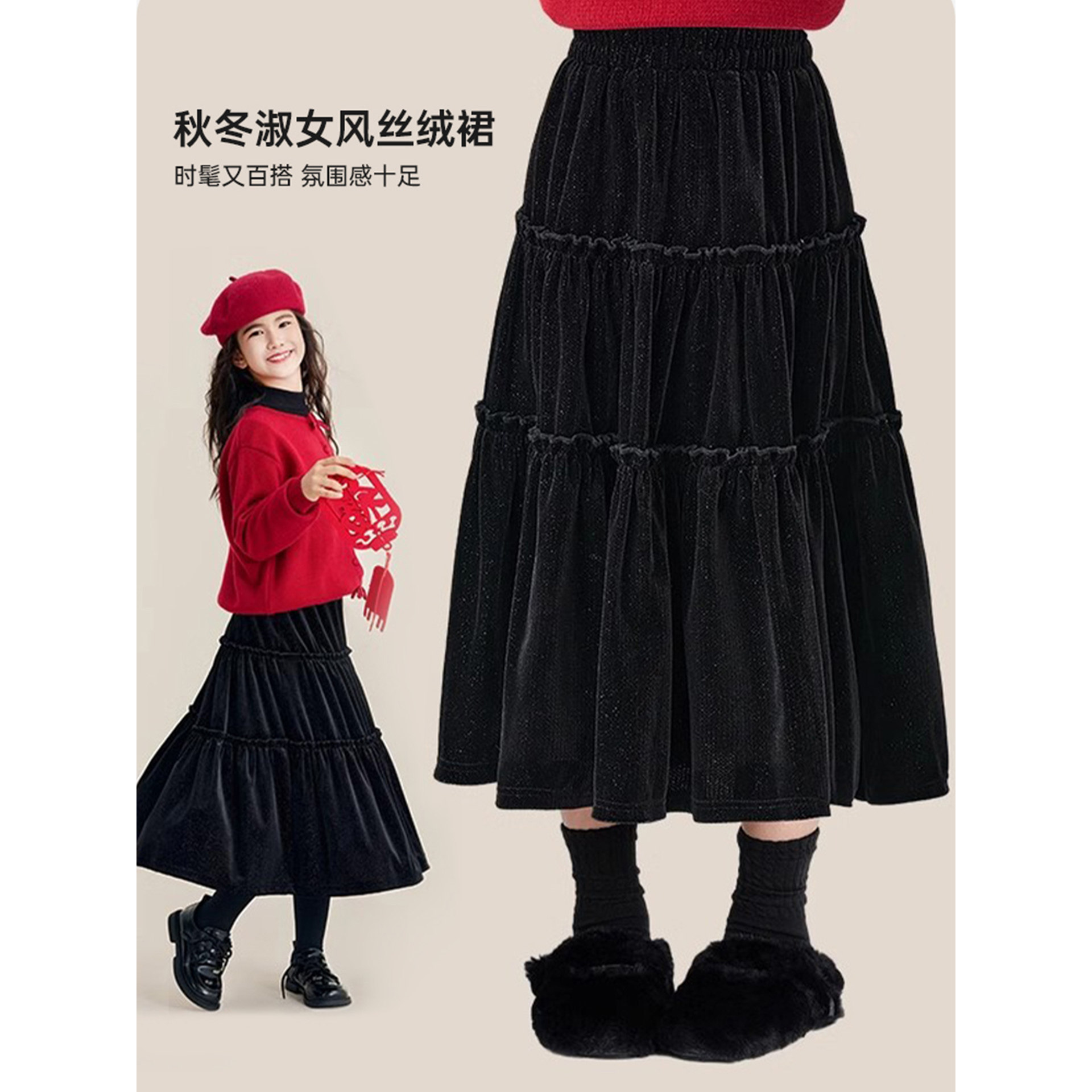 女童秋冬半身裙26冬装金丝绒短裙小女孩百褶公纱裙A字裙小众洋气