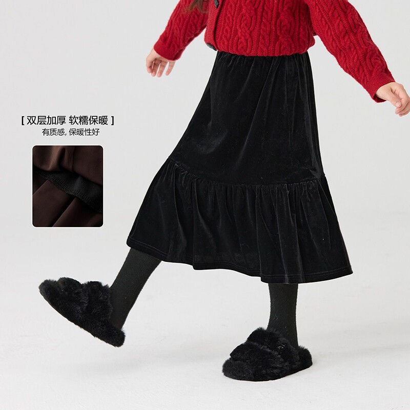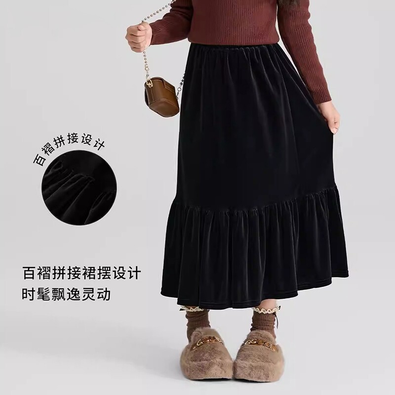 女童半身裙秋冬加绒儿童2025新款金丝绒裙子大童冬季女孩黑色长裙
