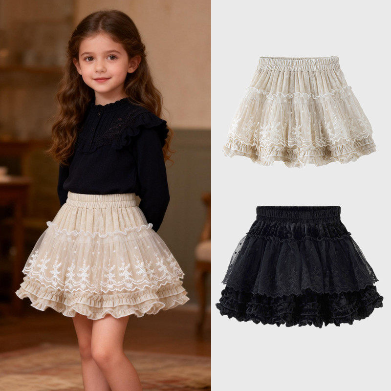 秋冬新款女童芭蕾风蕾丝花边蛋糕裙金丝绒高腰显瘦蓬蓬半身裙短裙