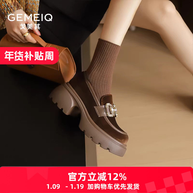 戈美其春秋女鞋金丝绒增高乐福鞋女棕色水钻厚底英伦小皮鞋女单鞋