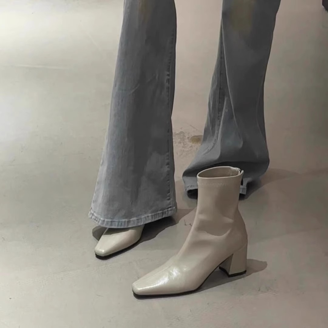 牛皮版~法式真皮高跟瘦瘦靴方头百搭气质通勤短靴子显瘦小裸靴女