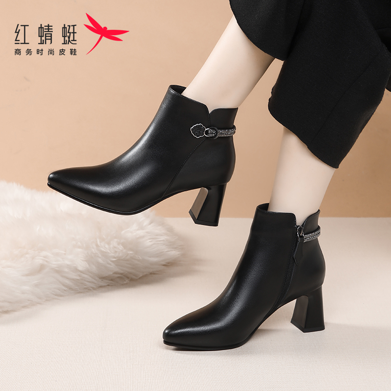 红蜻蜓女鞋新款高跟洋气小短靴女粗跟真皮裸靴冬季加绒妈妈款靴子