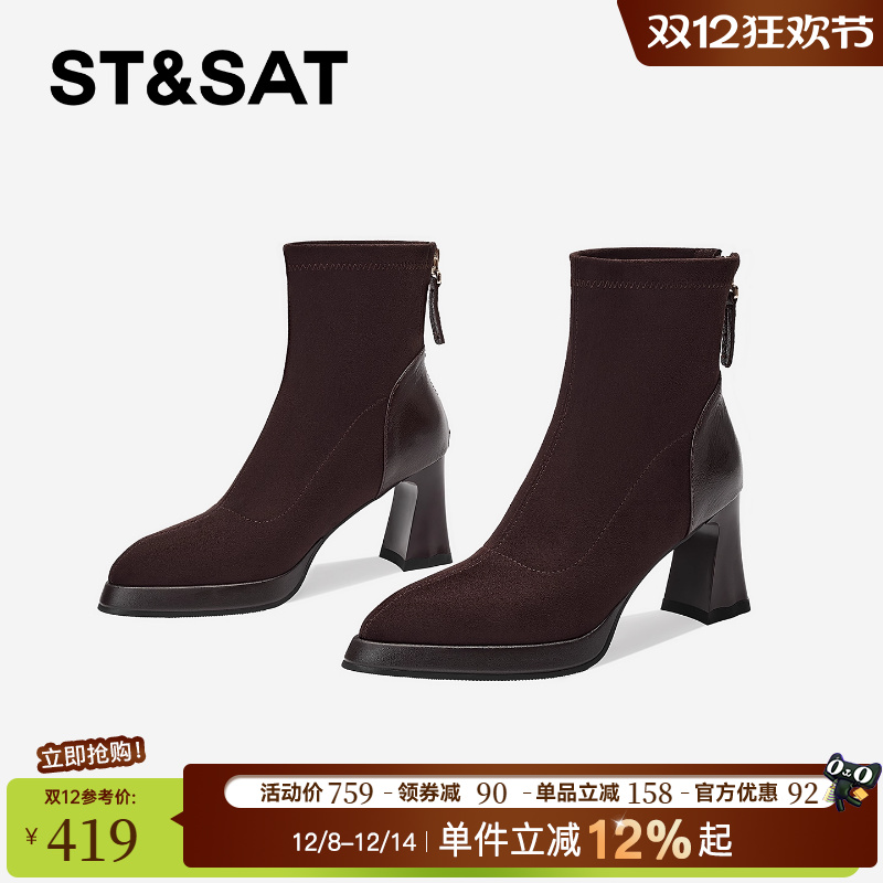 星期六复古高跟靴女2025秋冬尖头粗跟后拉链瘦瘦靴不累脚真皮裸靴