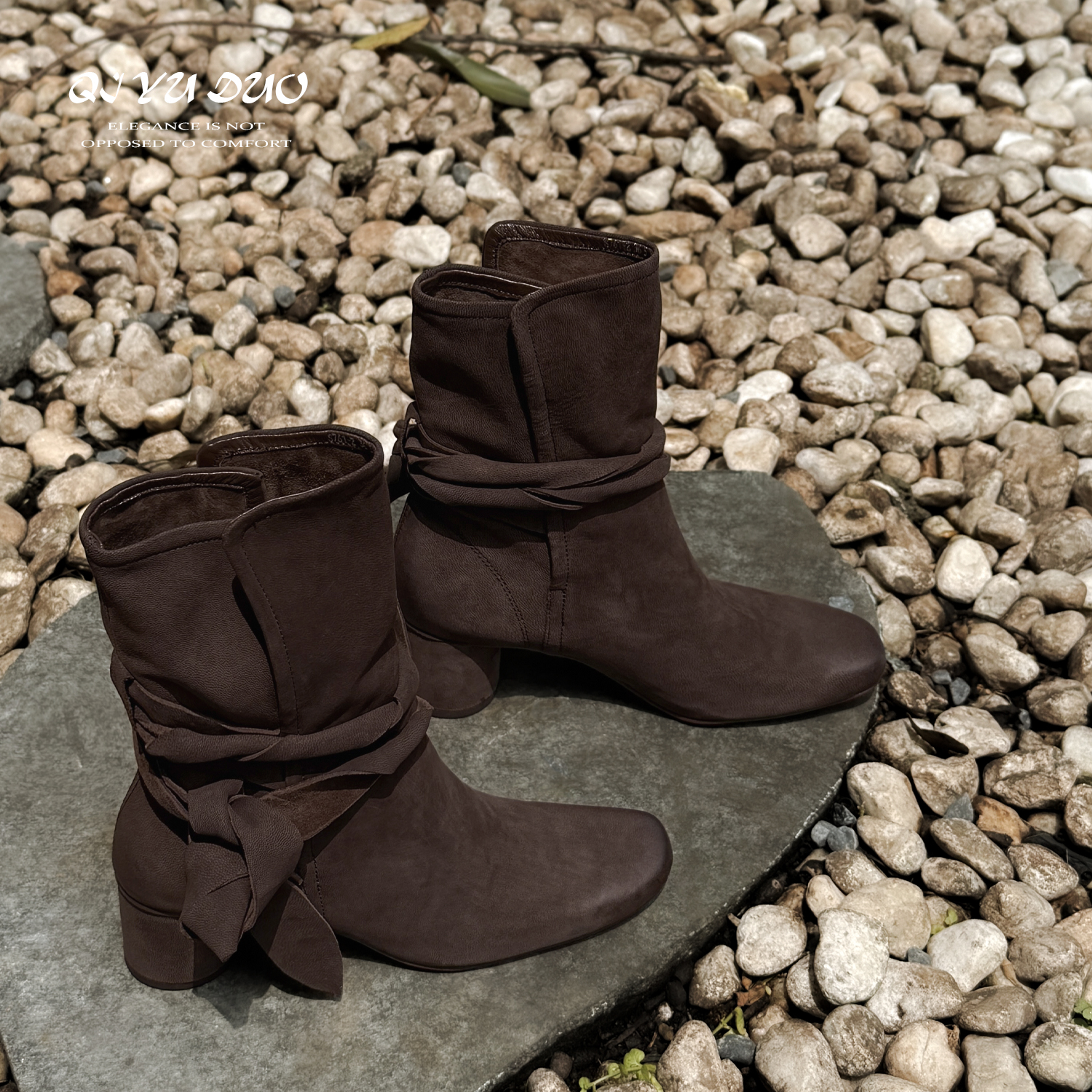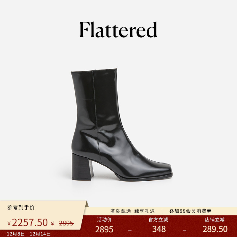 Flattered Karin真皮裸靴粗高跟显瘦中筒靴方头时装靴手工短靴女