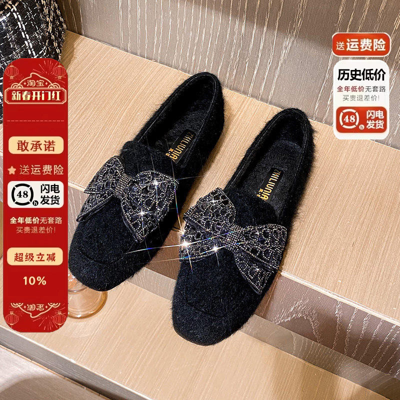 2025年秋冬季新款平底蝴蝶结加绒毛毛鞋女百搭棉鞋大码女鞋41到43