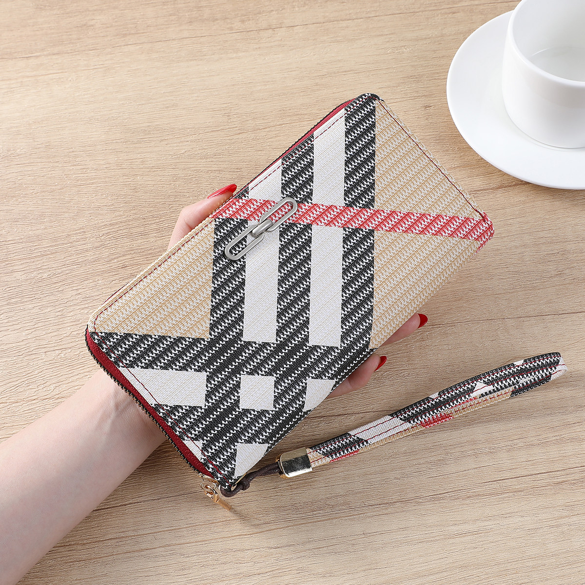 CarrKen欧美撞色几何图案钱包女长款拉链手拿包 大容量多卡位手包