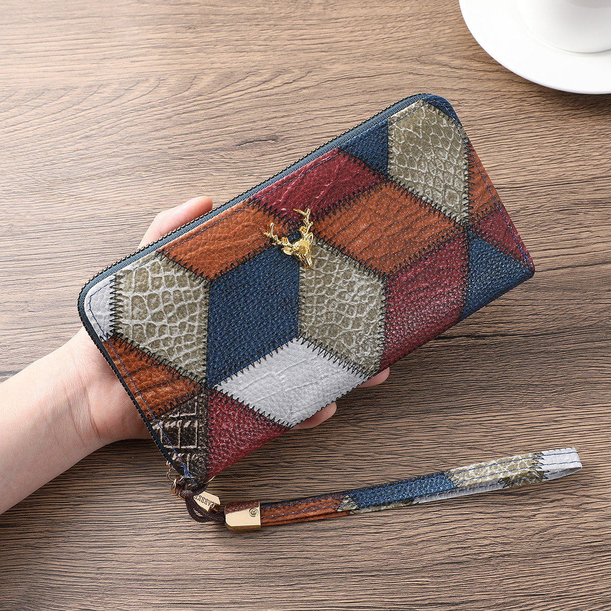 CarrKen欧美鹿头拼接撞色钱包女长款拉链手拿包 大容量高级手腕包