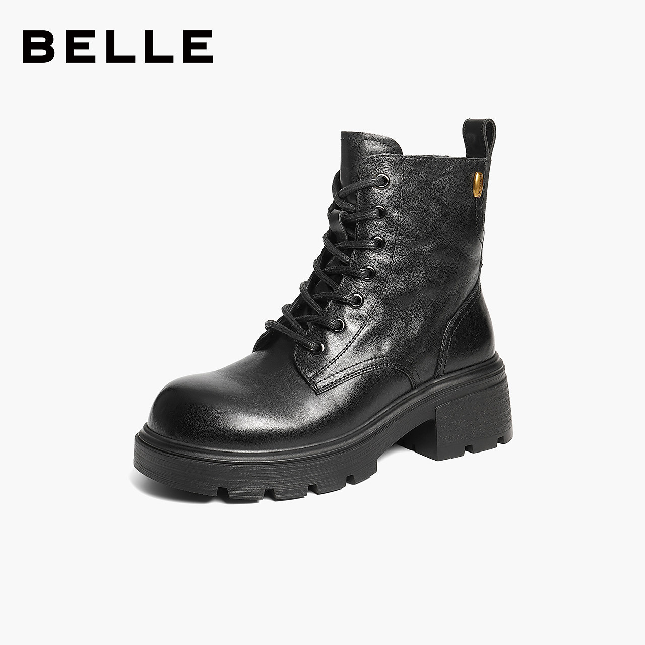 百丽英伦风马丁靴工装靴女鞋子冬新款真皮加绒羊皮短靴B7E2DDD4