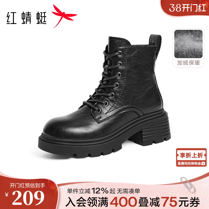 红蜻蜓女鞋冬季新款鞋子女士靴子马丁靴女秋冬真皮加绒短靴英伦风