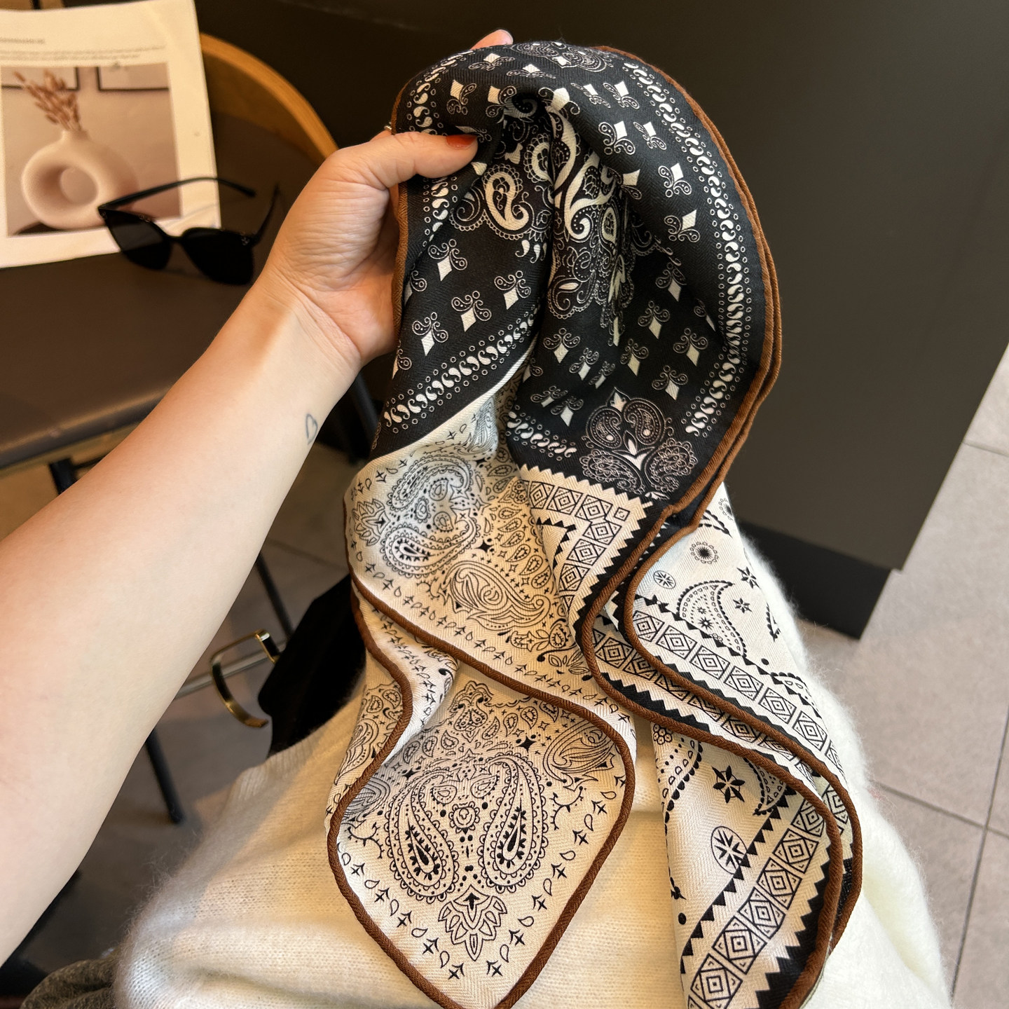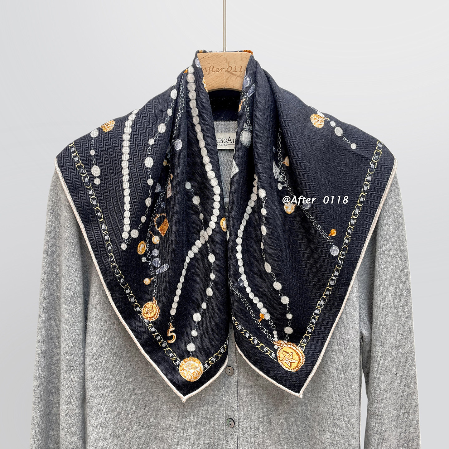After 丝毛中方巾!【珍珠链条】知性优雅真丝羊毛桑蚕丝围巾女