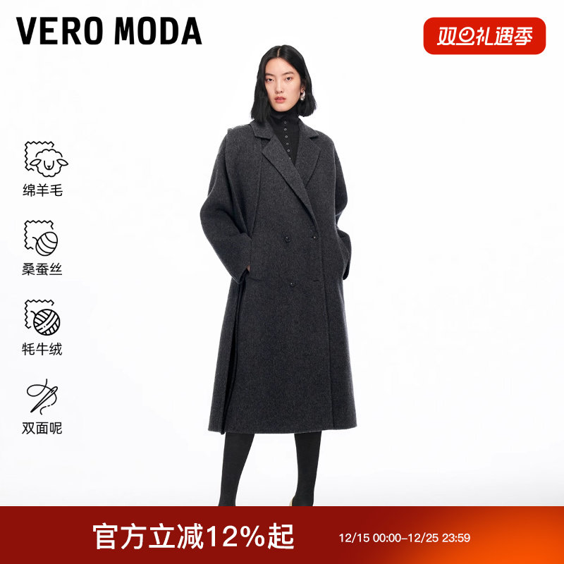 Vero Moda毛呢大衣2025冬新款含绵羊毛桑蚕丝围巾系带双面呢