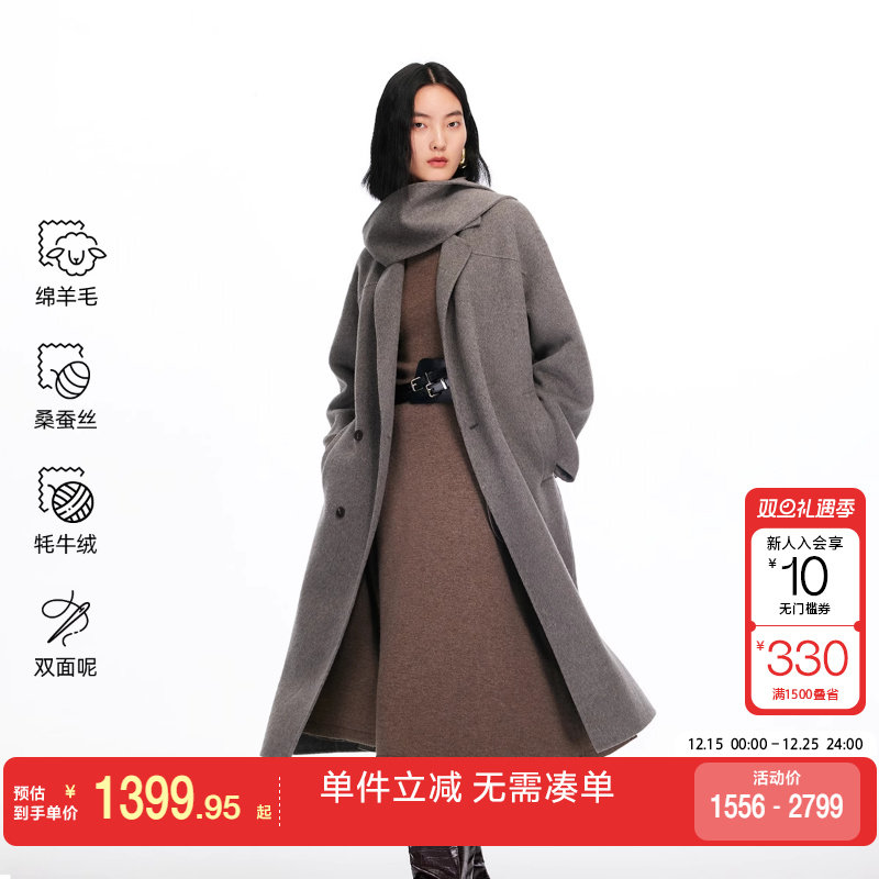 绫致Vero Moda毛呢大衣2025冬新款含绵羊毛桑蚕丝围巾系带双面呢