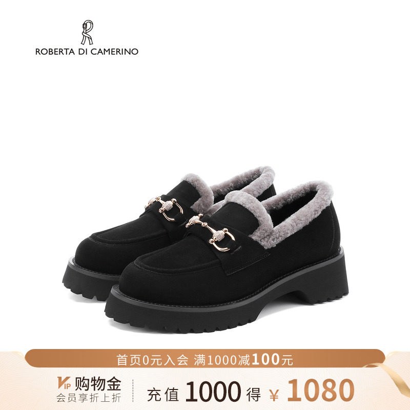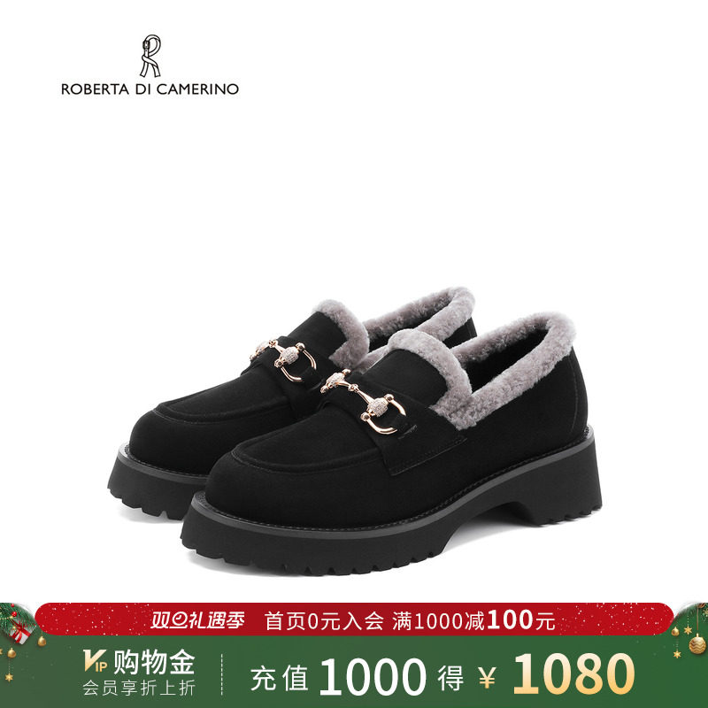 诺贝达冬季加绒乐福鞋金属扣饰增高复古通勤厚底毛茸女鞋RA257006