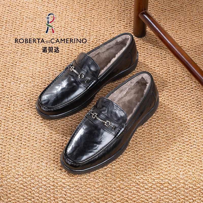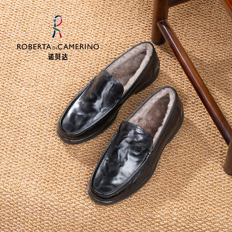 诺贝达2025秋冬新款男士商务休闲皮鞋真皮真毛加绒保暖软底乐福鞋