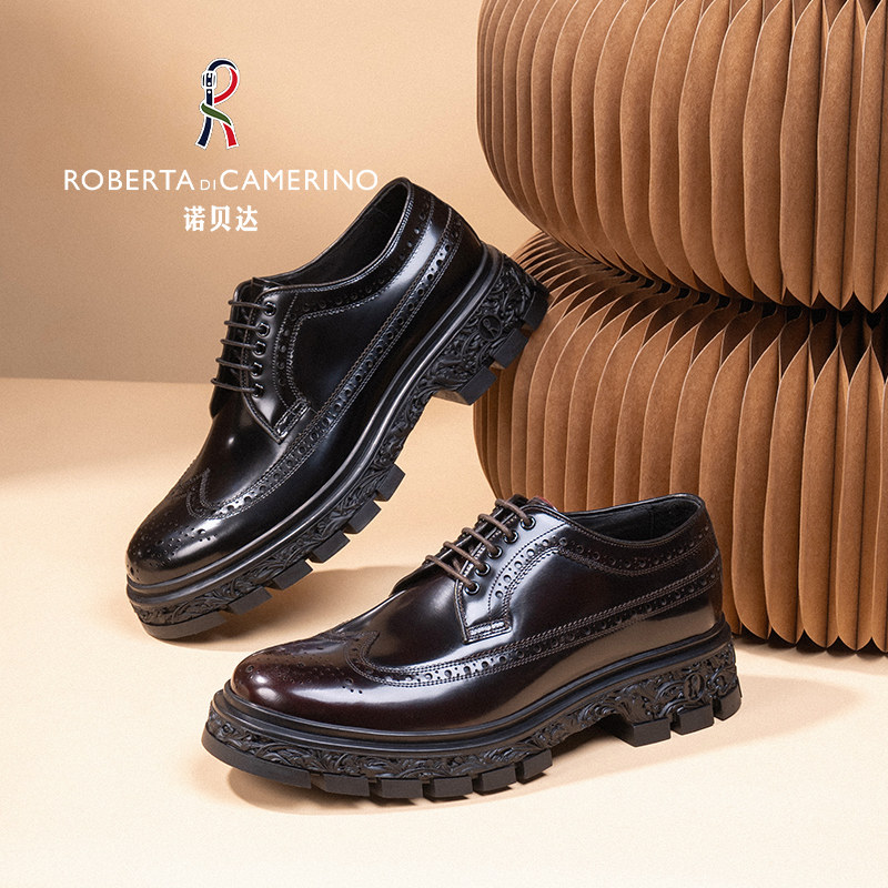 诺贝达商务正装皮鞋男士真皮开边珠雕刻厚底休闲系带布洛克皮鞋男