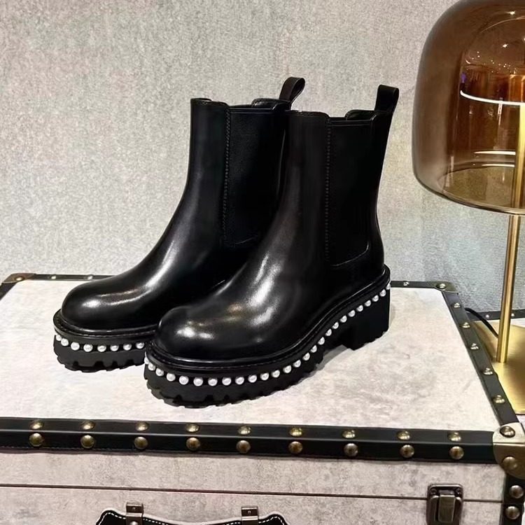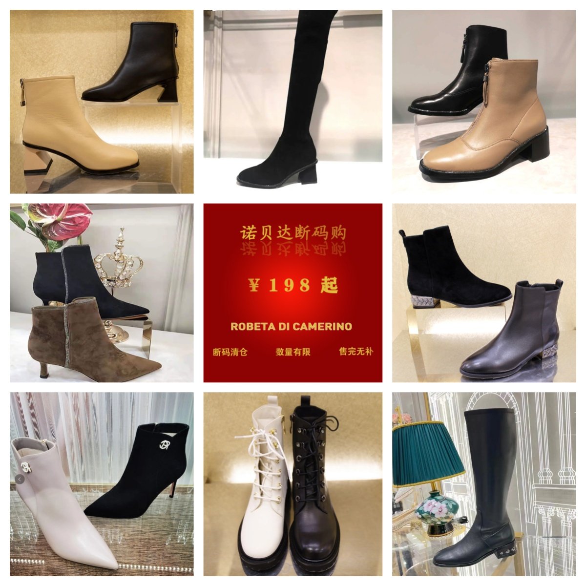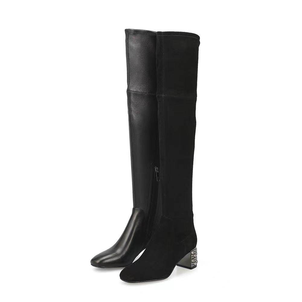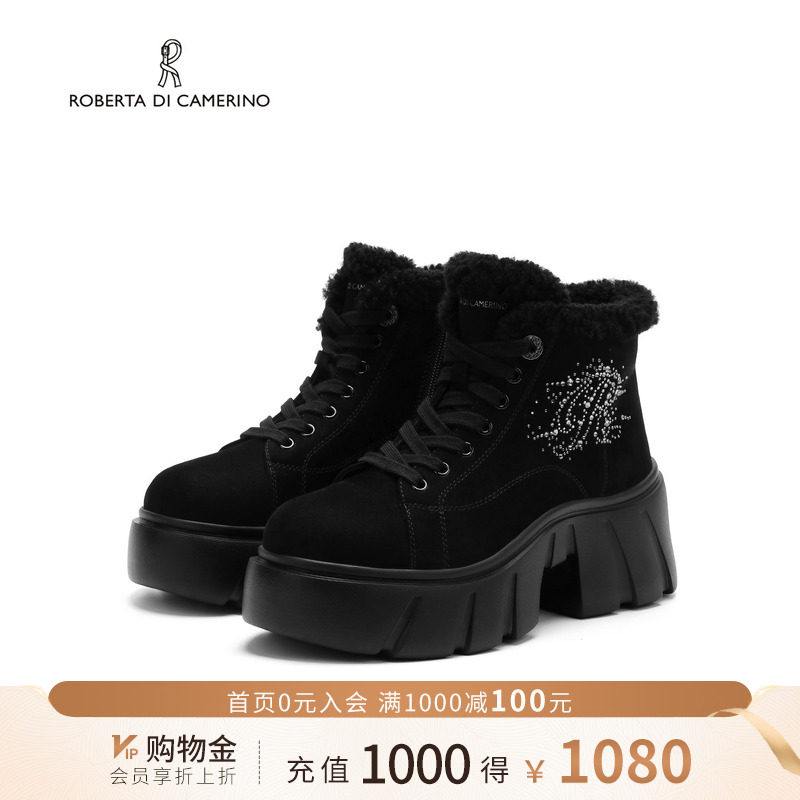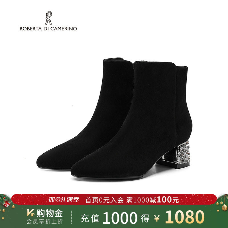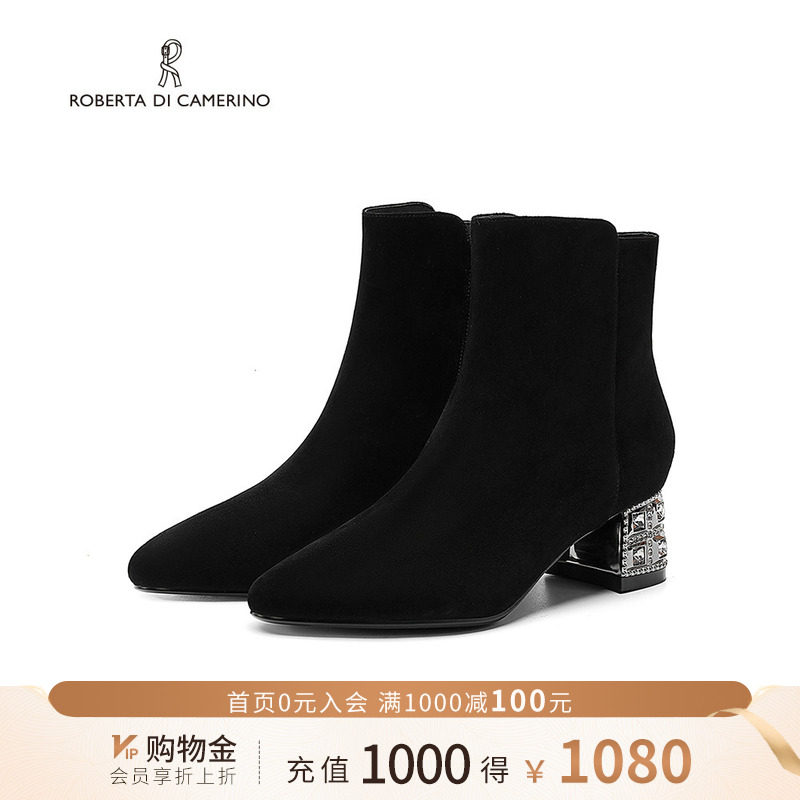 诺贝达女鞋女靴冬新简约百搭水钻后跟通勤时装靴中跟短靴RA247902