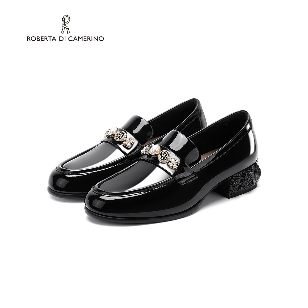 诺贝达珍珠轻奢乐福鞋通勤百搭单鞋花朵粗跟一脚蹬女鞋RL255501