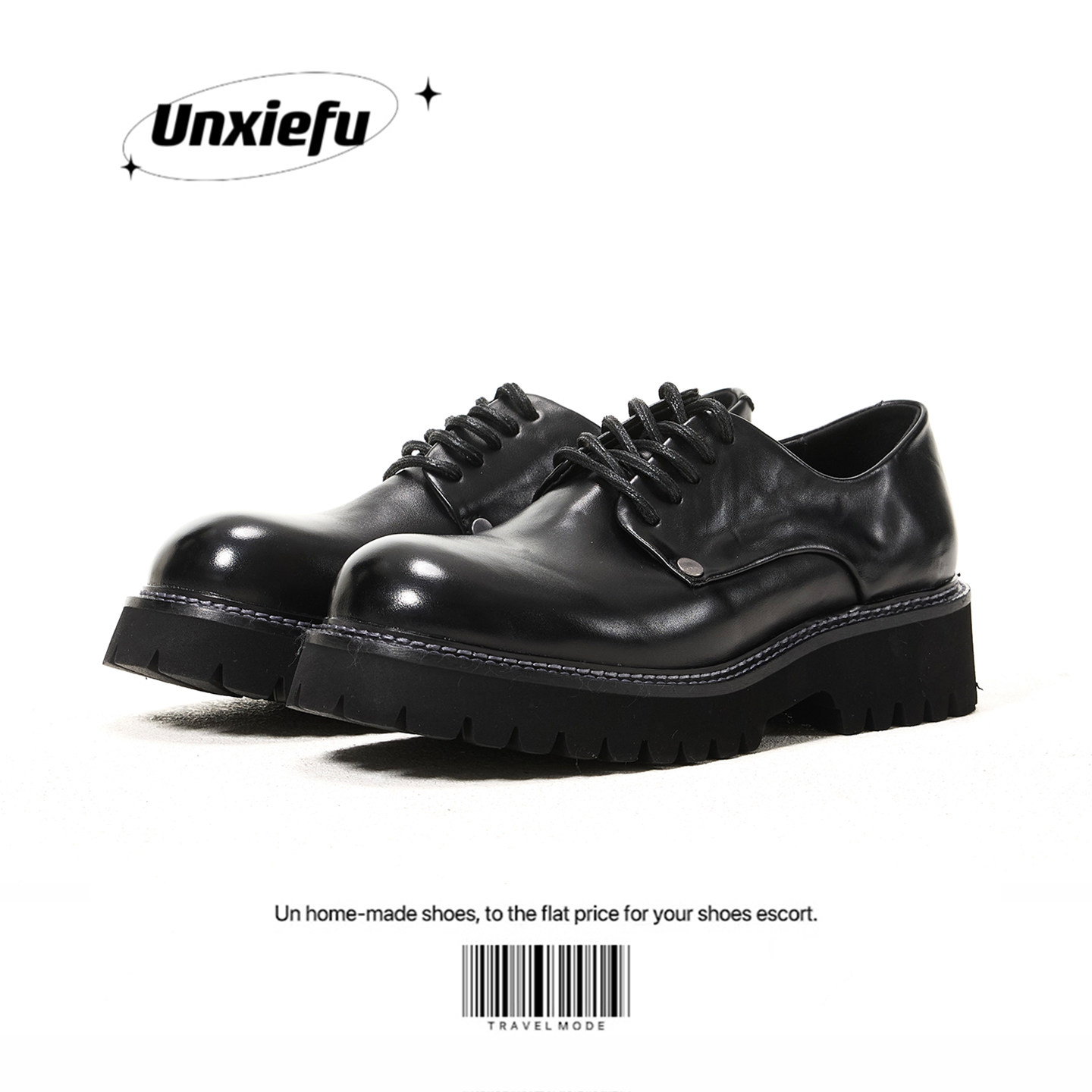 UNZIZHI 米奇铆钉德比鞋真牛皮褶皱增高皮鞋cleanfit翘圆大头男鞋