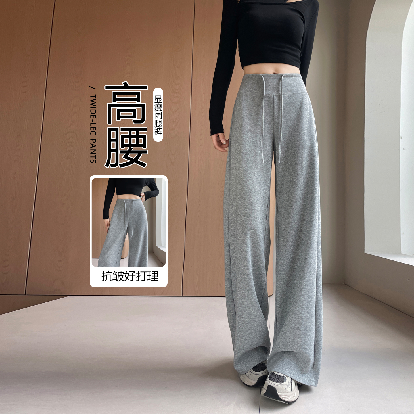 灰色阔腿裤女春秋高腰垂感窄版直筒裤宽松显瘦休闲瑜伽运动卫裤子