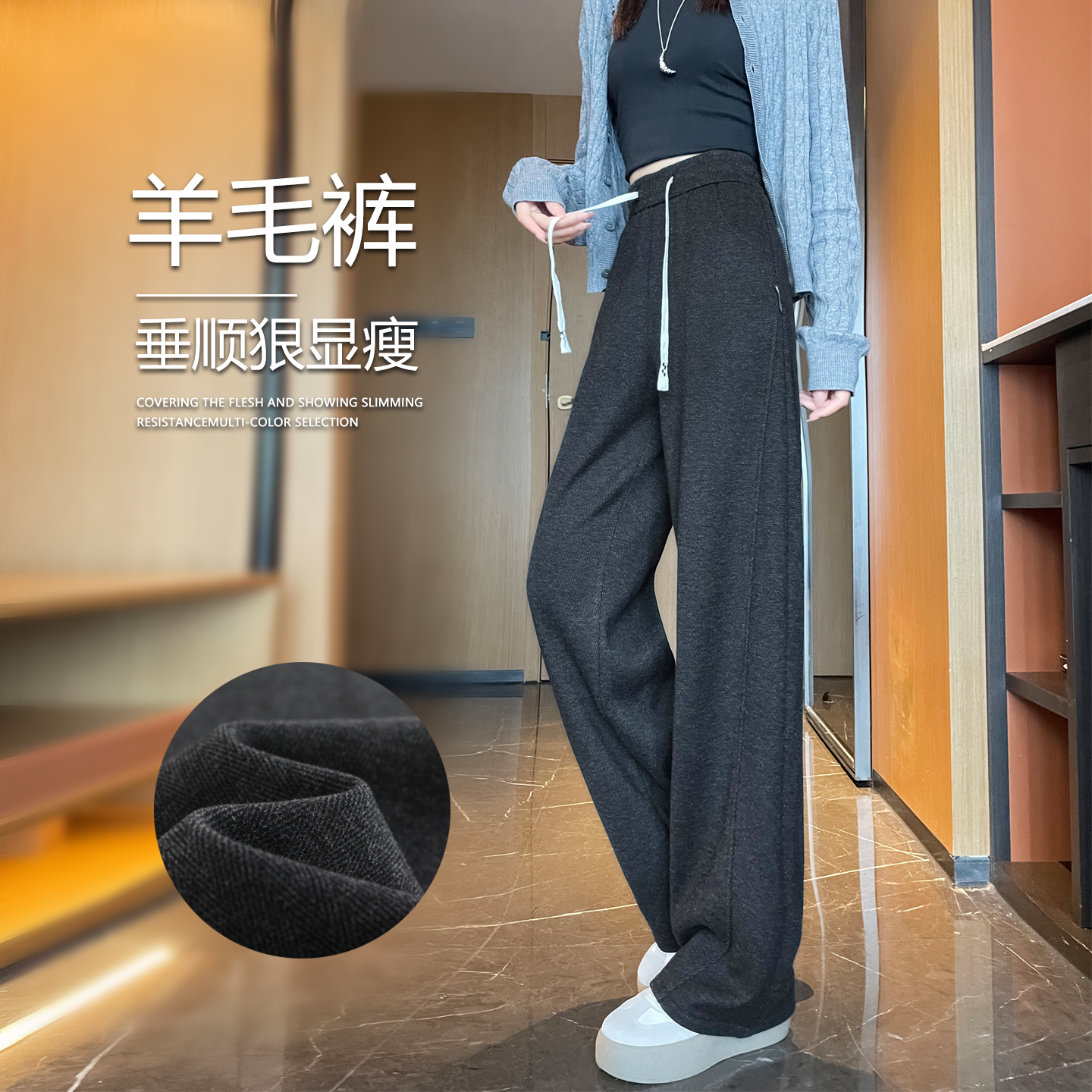 棕咖色羊毛阔腿裤女秋冬醋酸毛呢美拉德直筒瑜伽面膜加绒糯米裤子