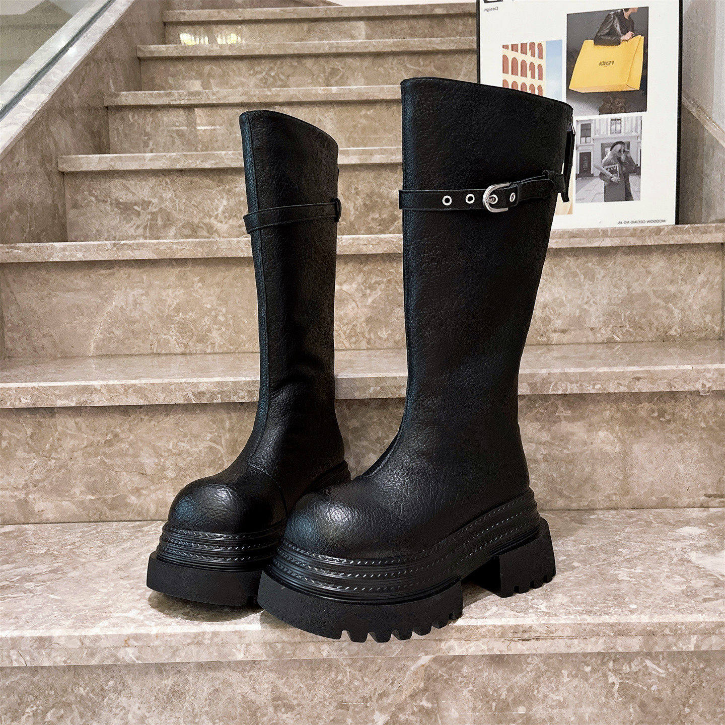 欧货真皮大头皮带扣厚底长靴骑士靴显瘦不过膝高筒马丁靴棉靴女鞋