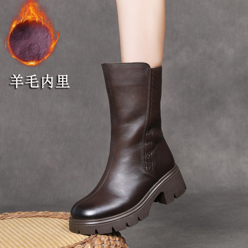 木森鸟25冬新加厚保暖真皮羊毛靴头层牛皮粗跟拉链马丁靴棉靴女
