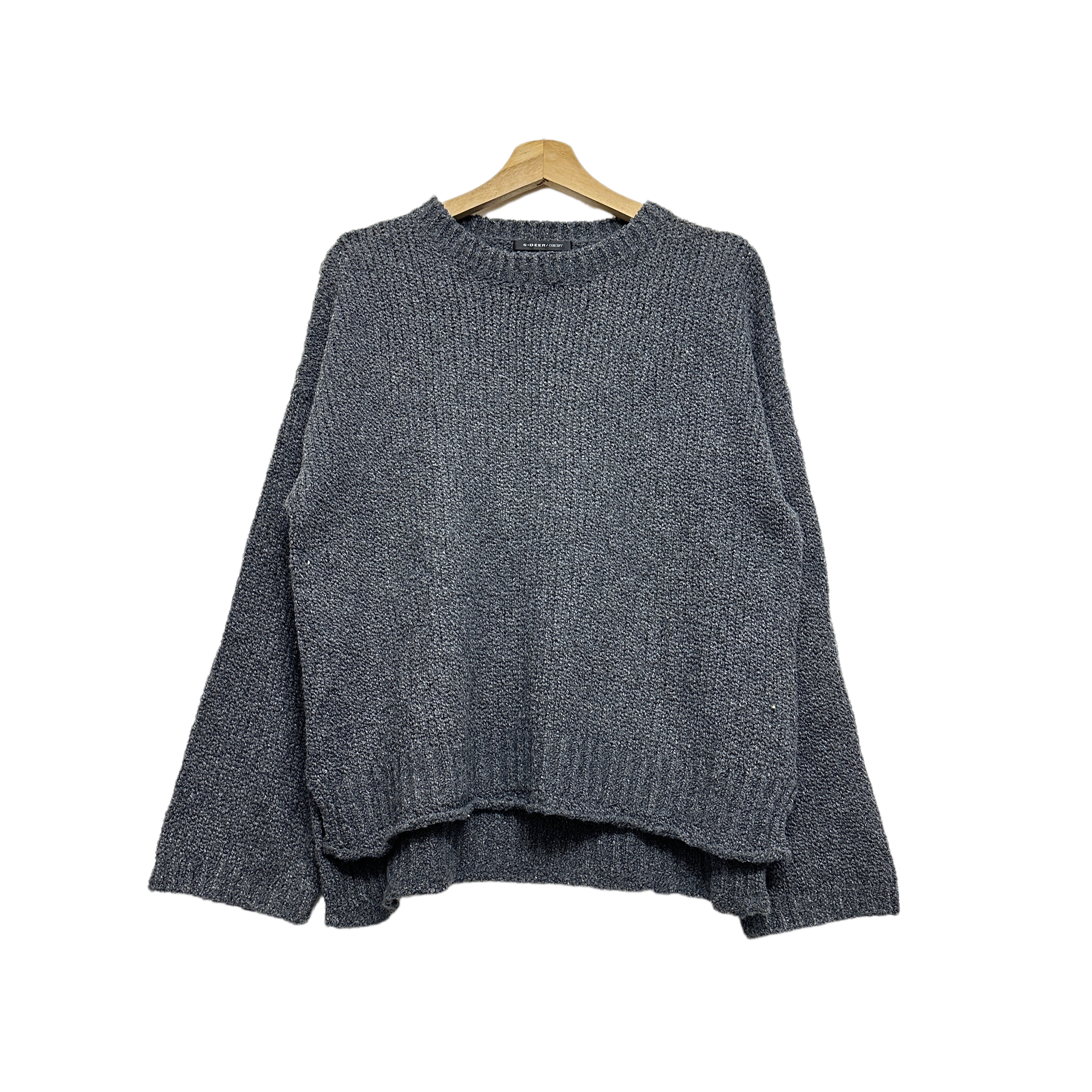 圣迪折扣女装 秋冬慵懒休闲圆领前短后长开衩落肩袖宽松针织毛衣