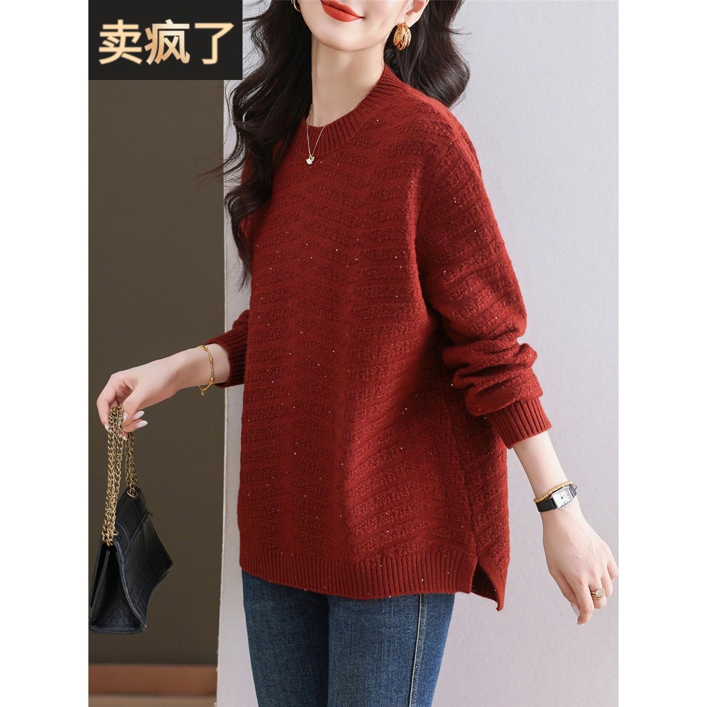 红色圆领前短后长开叉毛衣女2025秋冬宽松慵懒套头针织衫软糯上衣