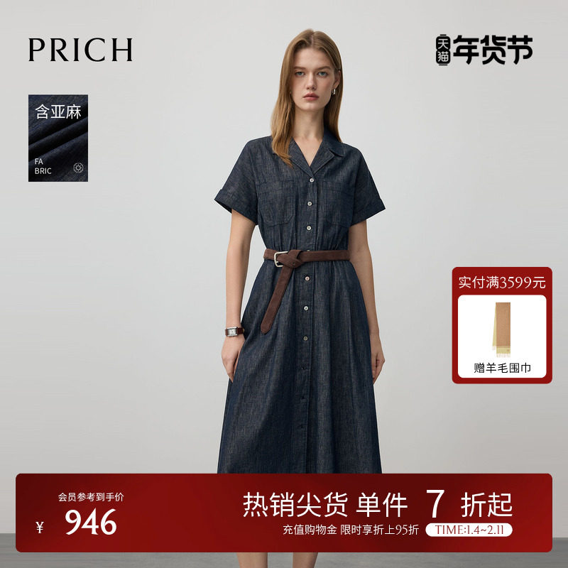 PRICH法式复古航海系含亚麻短袖牛仔连衣裙秋新款收腰长裙女