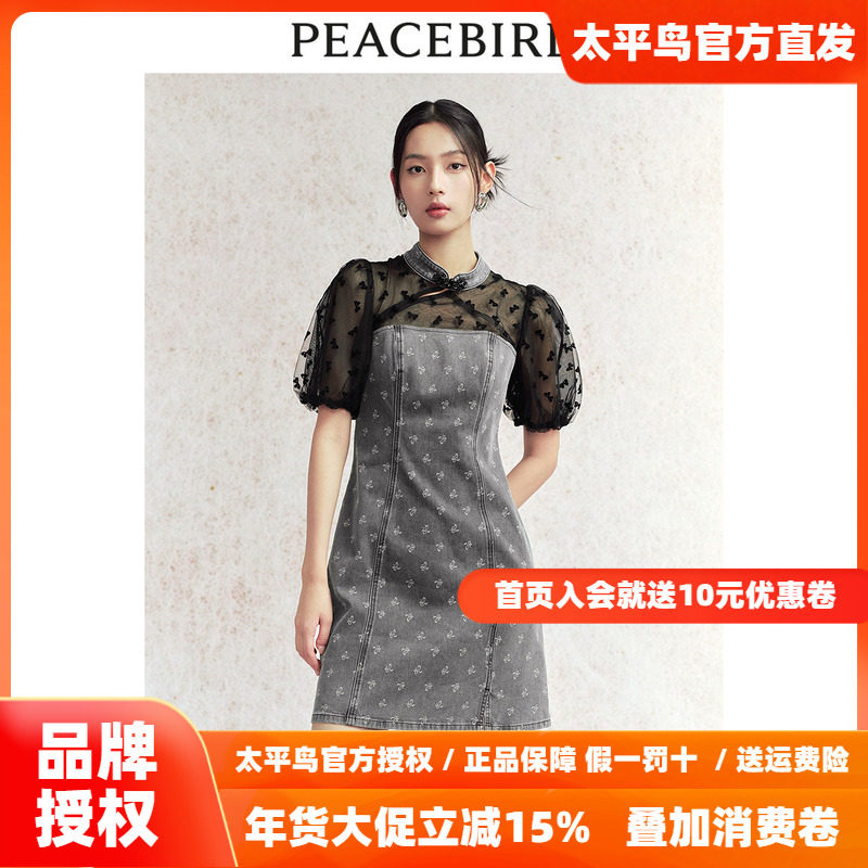 太平鸟女装新中式牛仔连衣裙秋新款国风拼接短裙洋气别致度假裙子