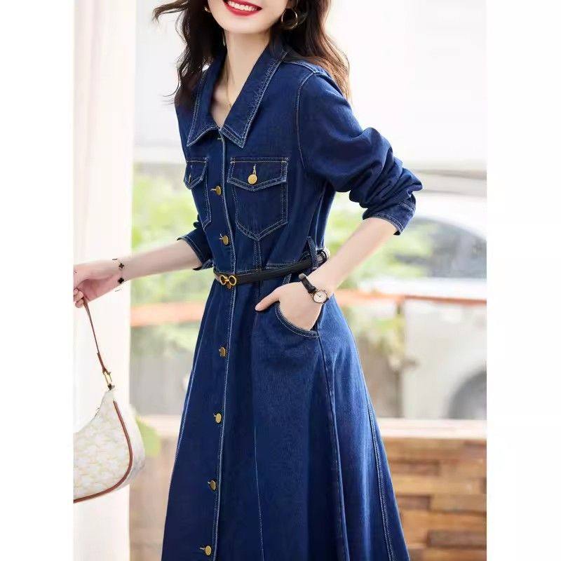 紫涵翻领收腰牛仔连衣裙女春秋季新款休闲显瘦单排扣A字中长裙子