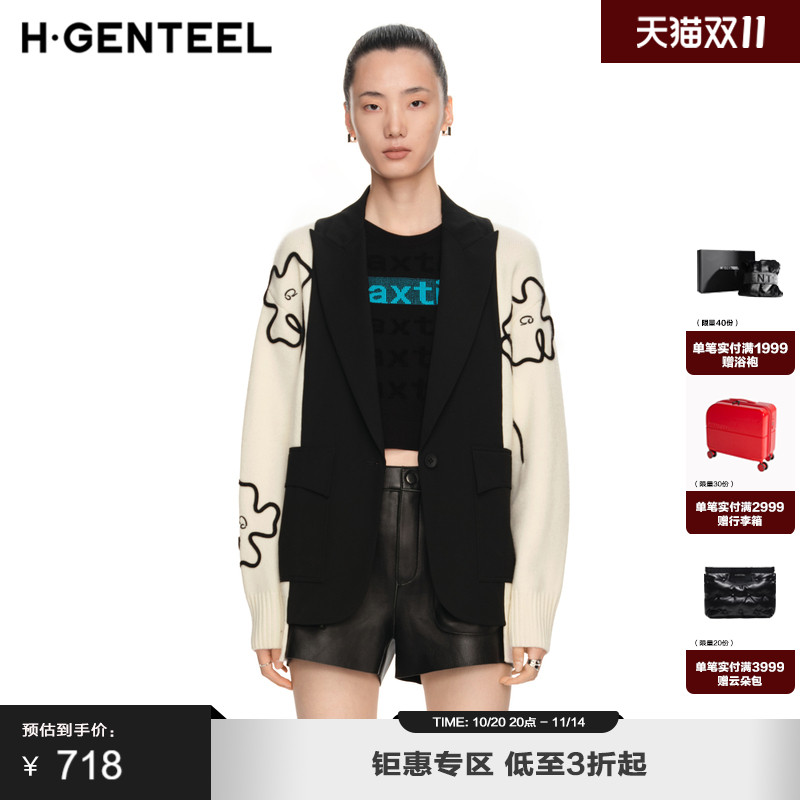 H·GENTEEL荷高新款春装女V领修饰脸型花边撞色拼接短外套女