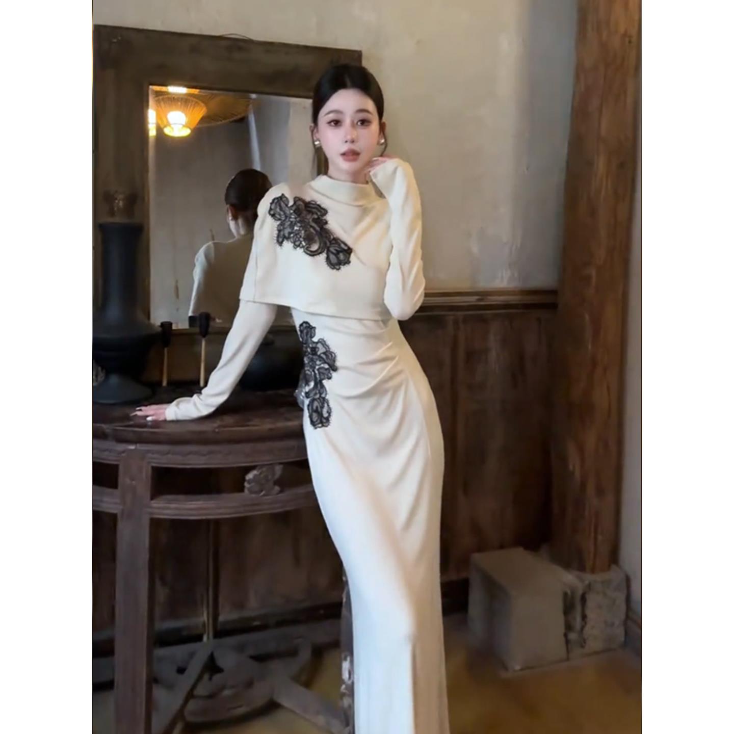 轻熟风气质蕾丝披肩连衣裙女装2025秋冬新款名媛高级收腰包臀长裙