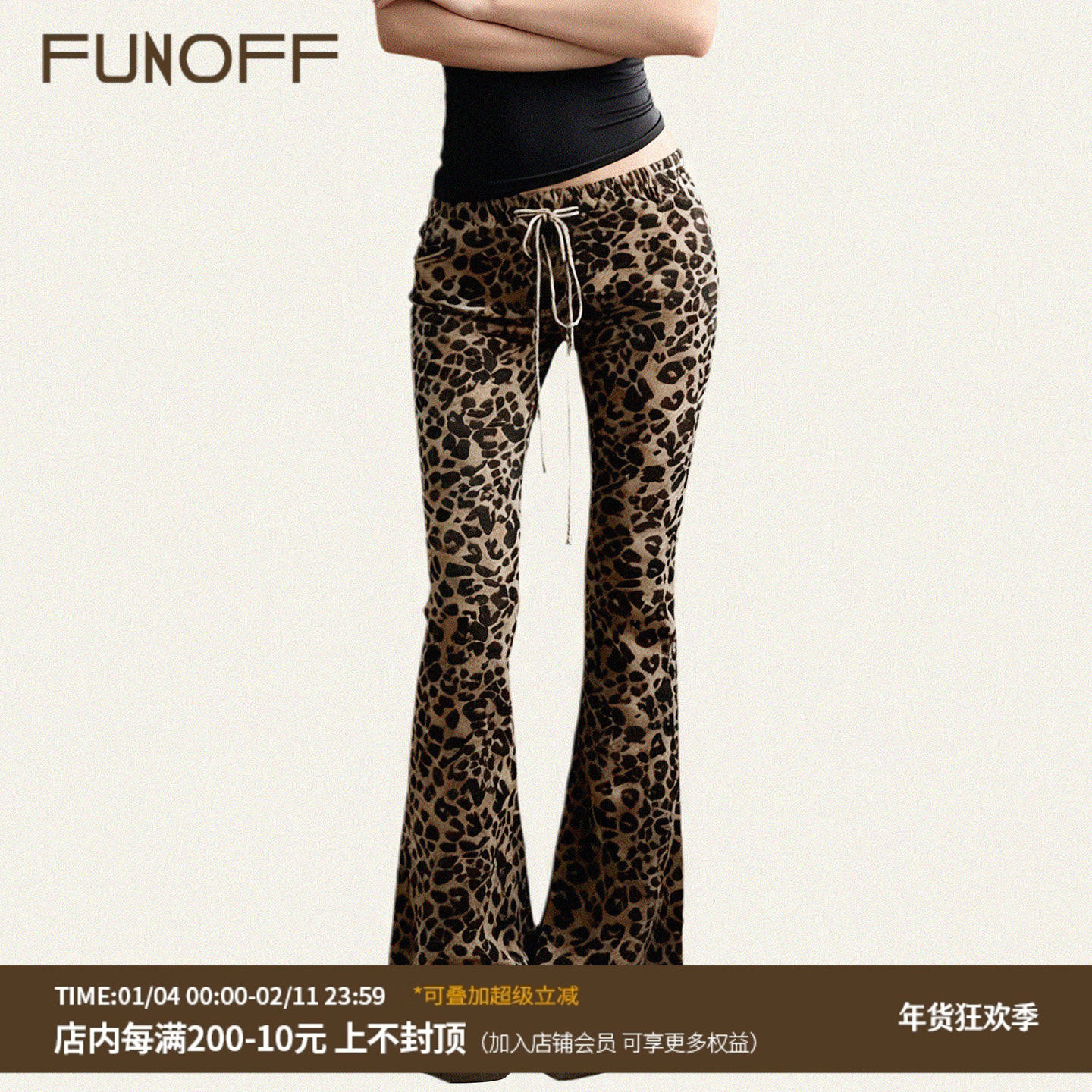 FUNOFF 美式复古豹纹绑带针织喇叭长裤轻亚低腰修身遛弯居家裤女