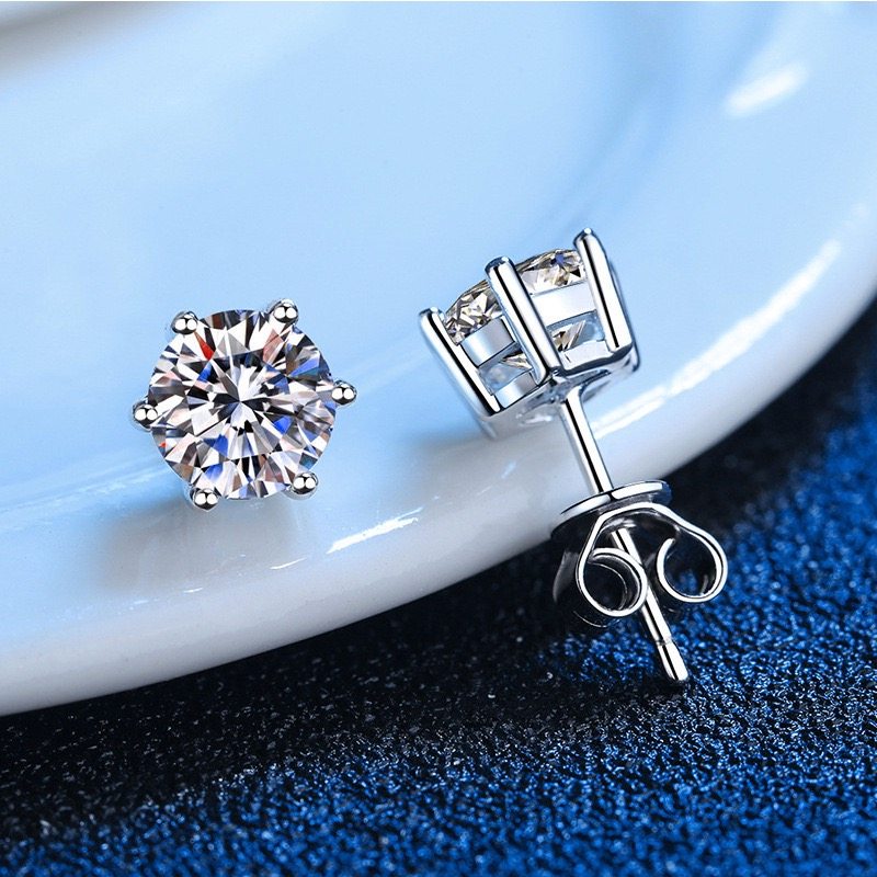 S925纯银莫桑石六爪耳钉50分一克拉钻石简约男女嘻哈养耳超闪耳饰