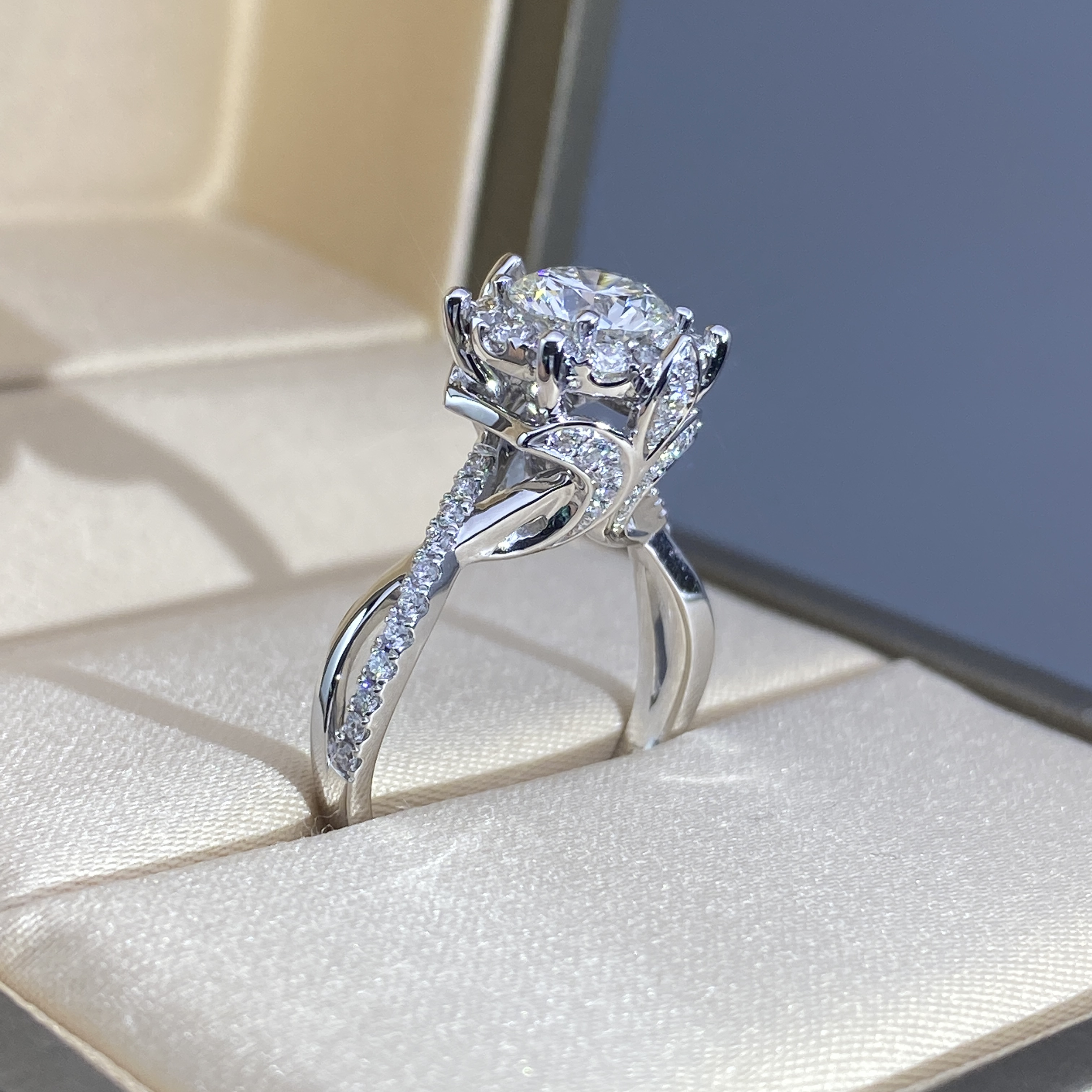钻石之乡河南钻石商丘人工钻纯银戒指女花瓣月桂枝一克拉活口钻戒