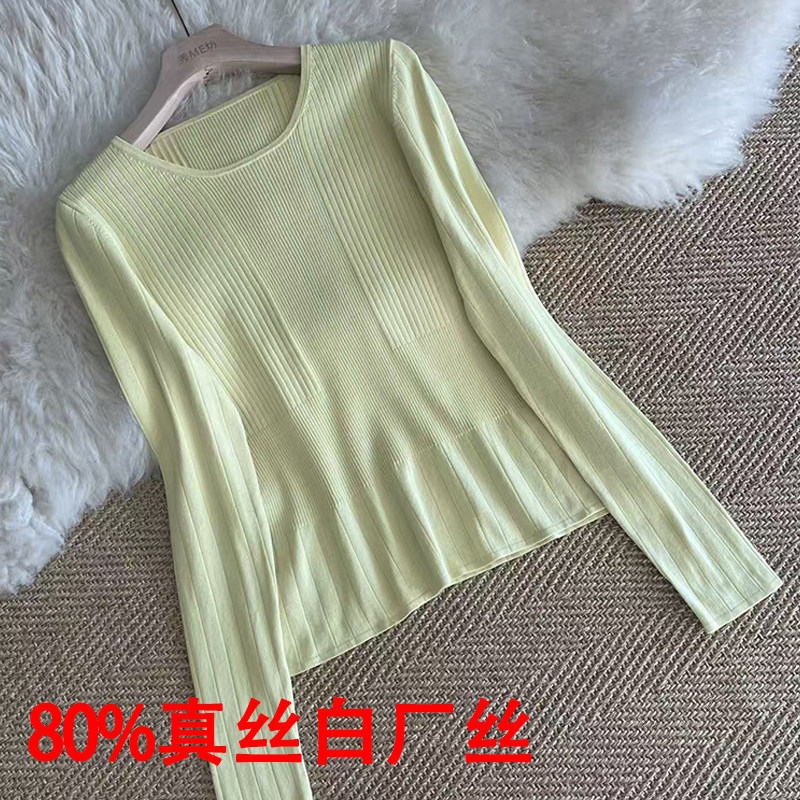 80桑蚕丝圆领的长袖T恤螺纹针织衫女白厂丝2025秋冬新真丝毛衣薄
