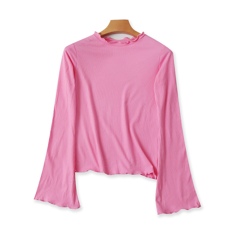 圆领木耳边螺纹针织衫 春秋新款喇叭袖T恤 弹力打底衫女上衣13324